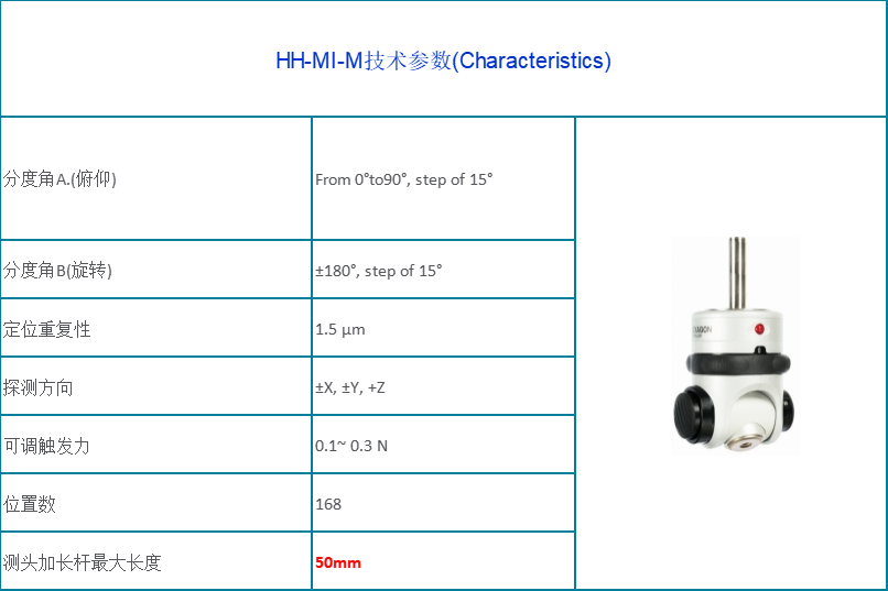 HH-MI-M可支持任何使用M8螺紋連接的測頭系統或配件,在保證高精度的同時還節省了操作時間,可配置長達50mm的M8螺紋加長桿;